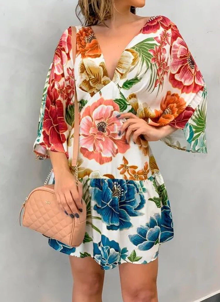 Vestito a Blusa con fantasia floreale e maniche a pipistrello che donano al capo leggerezza e semplicità. I colori di quest’abito e il motivo floreale danno alla donna che lo indossa un tocco di allegria e freschezza. Adatto a qualsiasi tipo di evento, come: cerimonie, party e brunch. Il tessuto è al 100% Polyester. Si consiglia lavaggio in acqua fredda