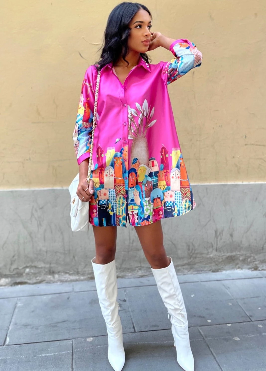 Questo vestito a camicione, è un capo d’abbigliamento molto particolare nelle sue caratteristiche. Indossato si posa morbidamente sul corpo della donna che l’utilizza, regalandole comodità e praticità, due caratteristiche che ogni donna ricerca in un capo. Le sue particolarità sono: i bottoni, la fantasia City multicolore e il tessuto effetto raso. Può essere adatto per giornate casual, o per serate impegnative, ciò dipende dagli accessori che gli vengono accostati. Il tessuto è al 95% poliestere e al 5% elastico. Si consiglia lavaggio a mano e in acqua fredda.