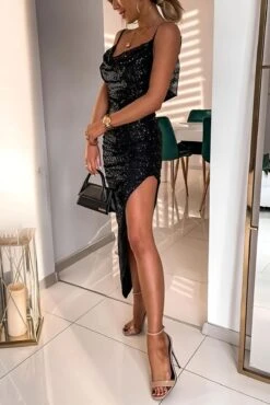 Vestito Donna Scollo Cuore Bretelle Paillettes Spacco Alto Asimmetrico Sensuale Elegante