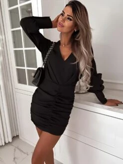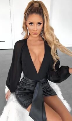 Vestito Donna Tubino Scollo V Profondo Manica Sbuffo Ecopelle Drappeggiato Elegante Sensuale