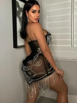 Vestito Donna Tubino Scollo Cuore Bretelle Frange Sensuale Elegante