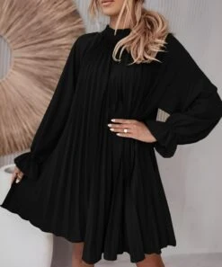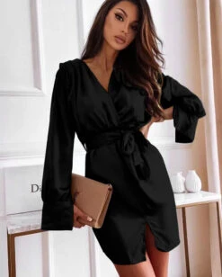 Vestito Donna Tubino Fantasia Scollo Profondo Manica Lunga Sbuffo