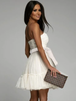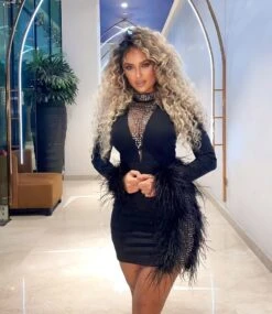 Linda Vestito Donna Tubino Scollo V Profondo Strass Piume Tulle Trasparente Spacco Elegante Sensuale