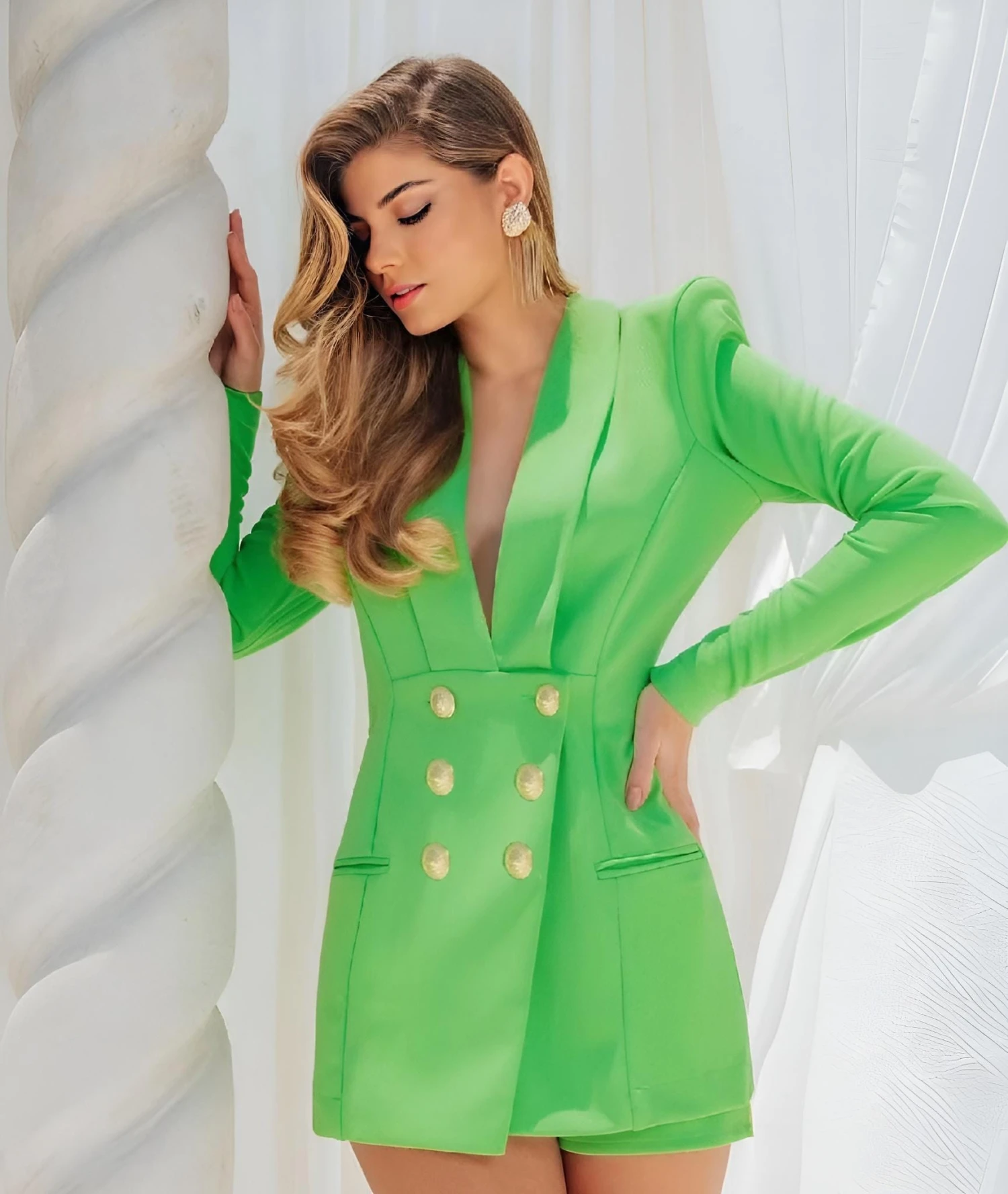 Vestito Donna Blazer Doppio Petto Scollo V Profondo Spalline Bottoni Elegante Sensuale