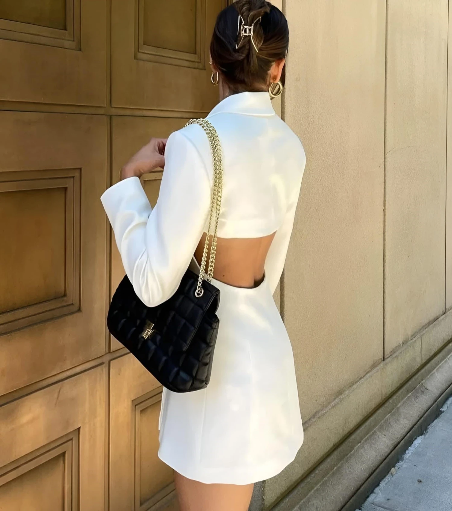 Elegante e sensuale vestito doppio petto blazer, tutte le donne amano averne uno nel proprio guardaroba e indossarlo nelle occasioni speciali. Le sue caratteristiche sono: la chiusura doppio petto, i bottoni frontali, la sua vestibilità morbida che dona comodità e stile, e la schiena scoperta. Adatto per uscite giornaliere, pomeridiane e serali o eventi speciali, lavoro, feste; insomma un capo così ti salverà dalle giornate indecise.