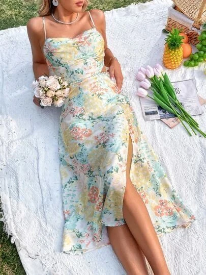 Vestito Donna Bretelle Spacco Elegante Fantasia