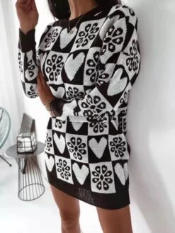 Vestito Donna Maxi Pull Morbido Bicolore Fantasia Cuori Fiori