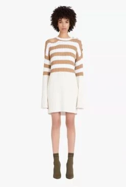Questo vestito stile casual-elegante è perfetto per chi ama la moda e la comodità, porta un foro sulla spalla destra e sulla sinistra e dei bottoni in oro, fantasia a righe sulla parte superiore e sulle maniche, mentre nella parte inferiore del vestito è completamente in tinta unita. Questo abito è un’aggiunta impeccabile a qualsiasi collezione, facile da abbinare con qualsiasi accessorio: scarpa classica o sportiva, è un capo che non può mancare. Il tessuto è al 90% poliestere e 10% elastan. Si consiglia lavaggio a mano e in acqua fredda.
