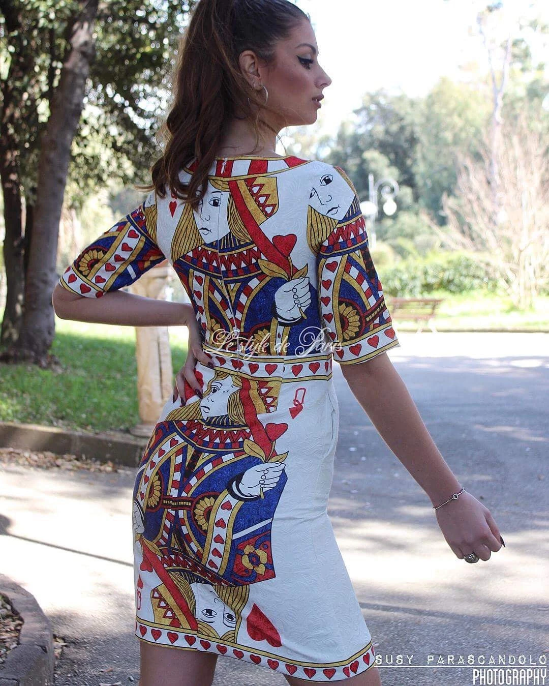 Vestito fantasia mezza manica di tessuto non elasticizzato, è un capo particolare nel suo genere, grazie alla fantasia che riprende la regina di cuori delle carte francesi. Questo capo può essere adatto per feste, party, cocktail party e cerimonie. Regala alla donna che lo utilizza, eleganza e charme, due caratteristiche che la valorizzano in qualsiasi contesto essa si trovi. Il tessuto è al 100% poliestere. Si consiglia lavaggio in acqua fredda