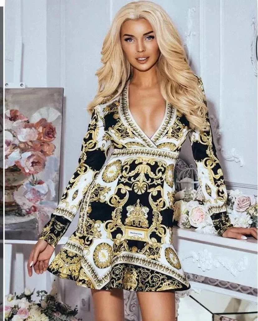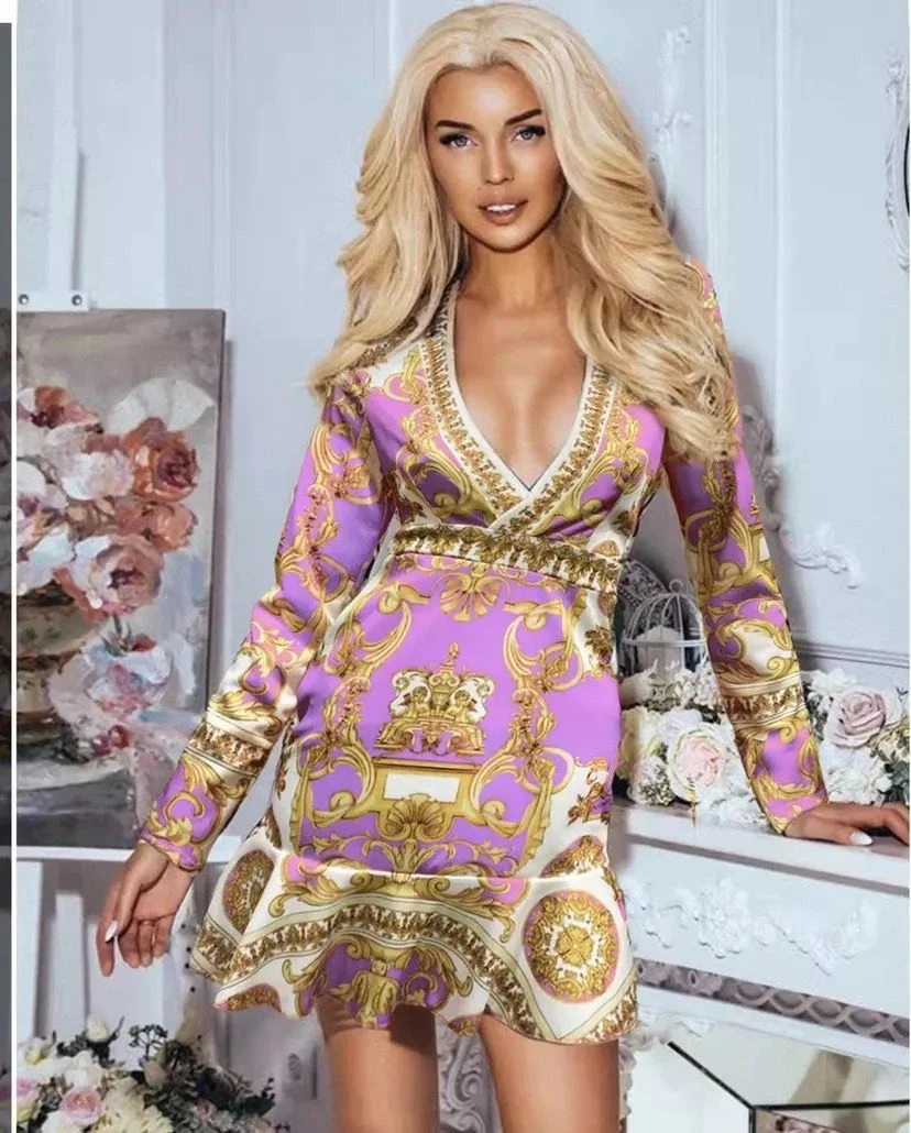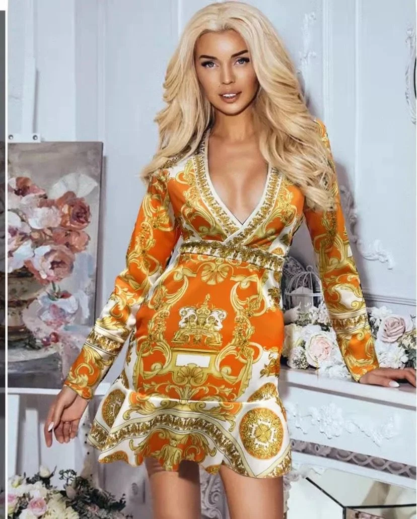 Elegante e con stile glamour, è un vestito fantastico. Le sue caratteristiche sono: lo scollo a V, le maniche lunghe morbide, fasciato in vita per risaltarne le forme, e la sua stupenda fantasia, molto amata da tutte e che ti fa sentire sempre alla moda.