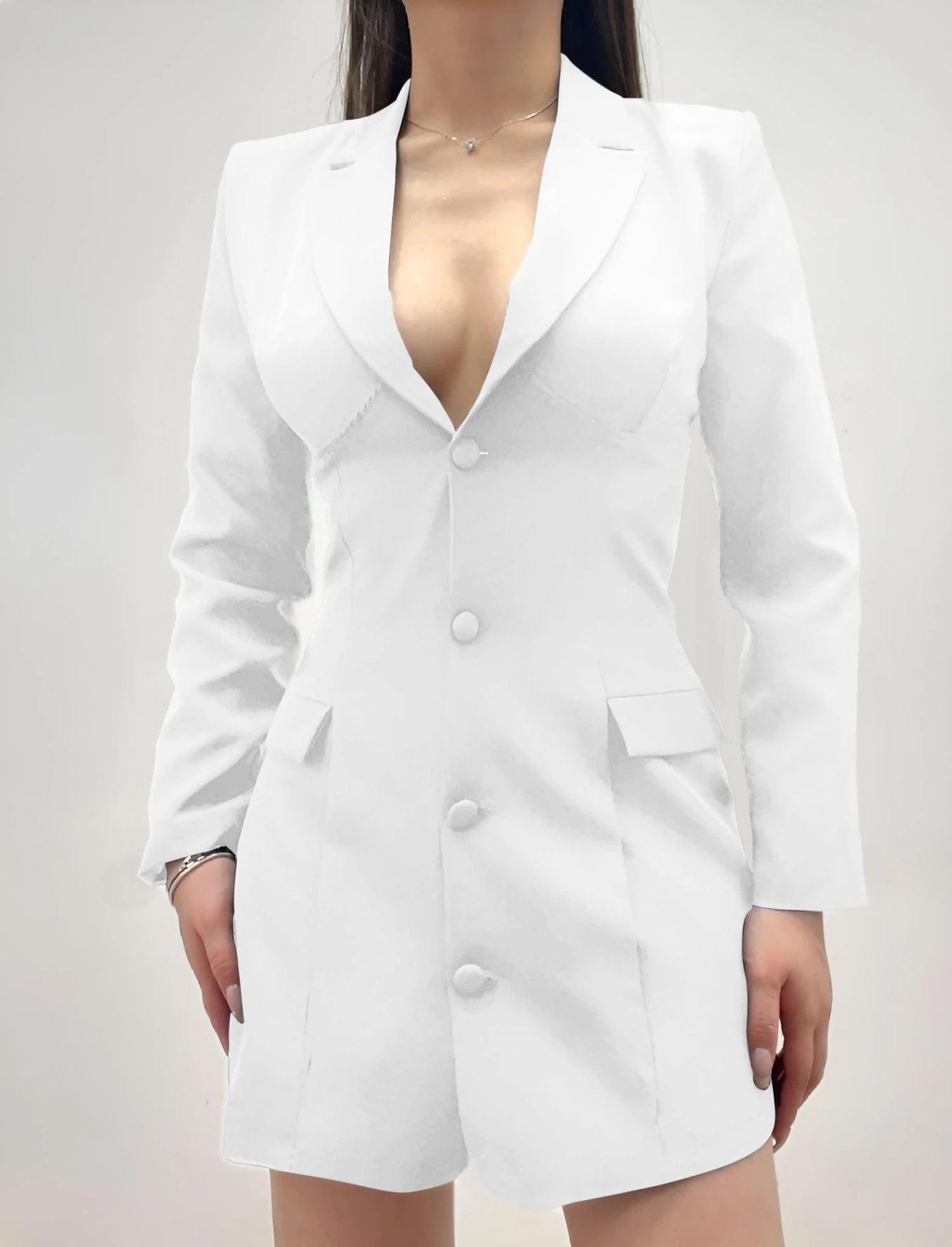 Vestito Donna Giacca Bottoni Scollo V Profondo Colletto Manica Lunga Elegante Sensuale