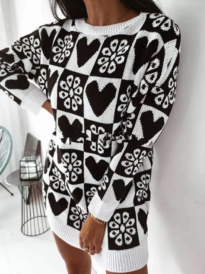 Vestito Donna Maxi Pull Morbido Bicolore Fantasia Cuori Fiori