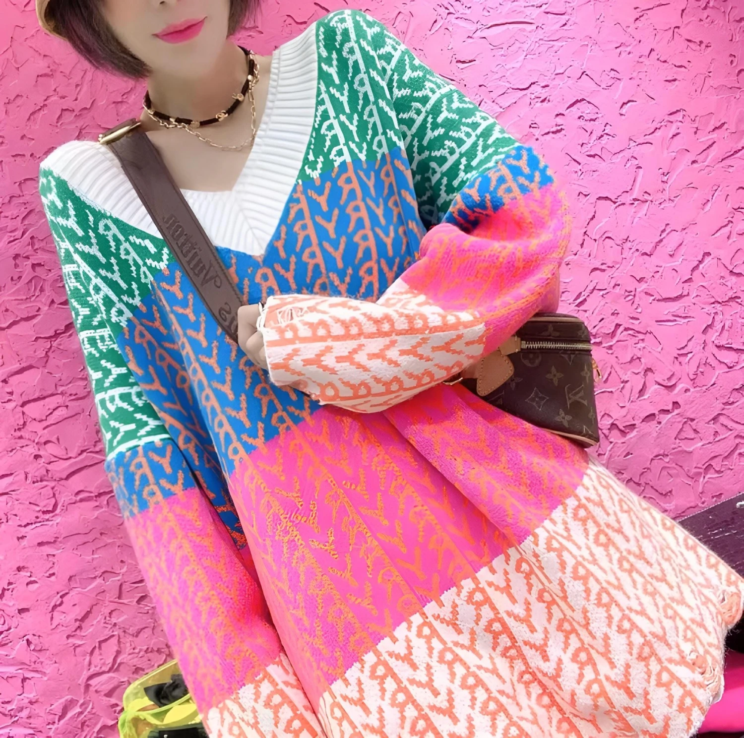 Questo vestito maxi-pull, è un capo che regala alla donna che lo indossa comodità e spensieratezza. Le sue particolarità sono: la fantasia multicolore, lo scollo a V e la morbidezza. Questo vestito se affiancato dagli accessori giusti, può essere indossato in qualsiasi occasione, dalla più semplice alla più importante, come ad esempio: cene con amici, per passeggiate, oppure per delle semplici serate da passare in dolce compagnia. Possono essere accostati accessori come: sneakers, stivali e borse di varie dimensioni. Il tessuto è al 95% poliestere e al 5% elastico. Si consiglia lavaggio a mano e in acqua fredda.