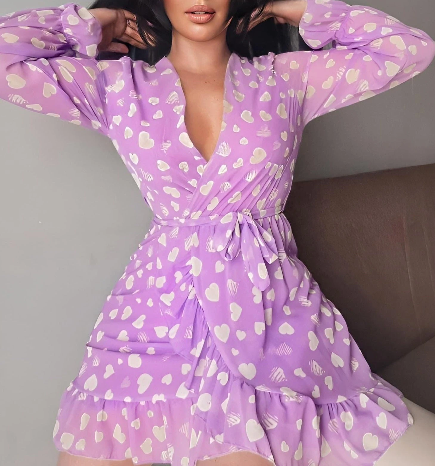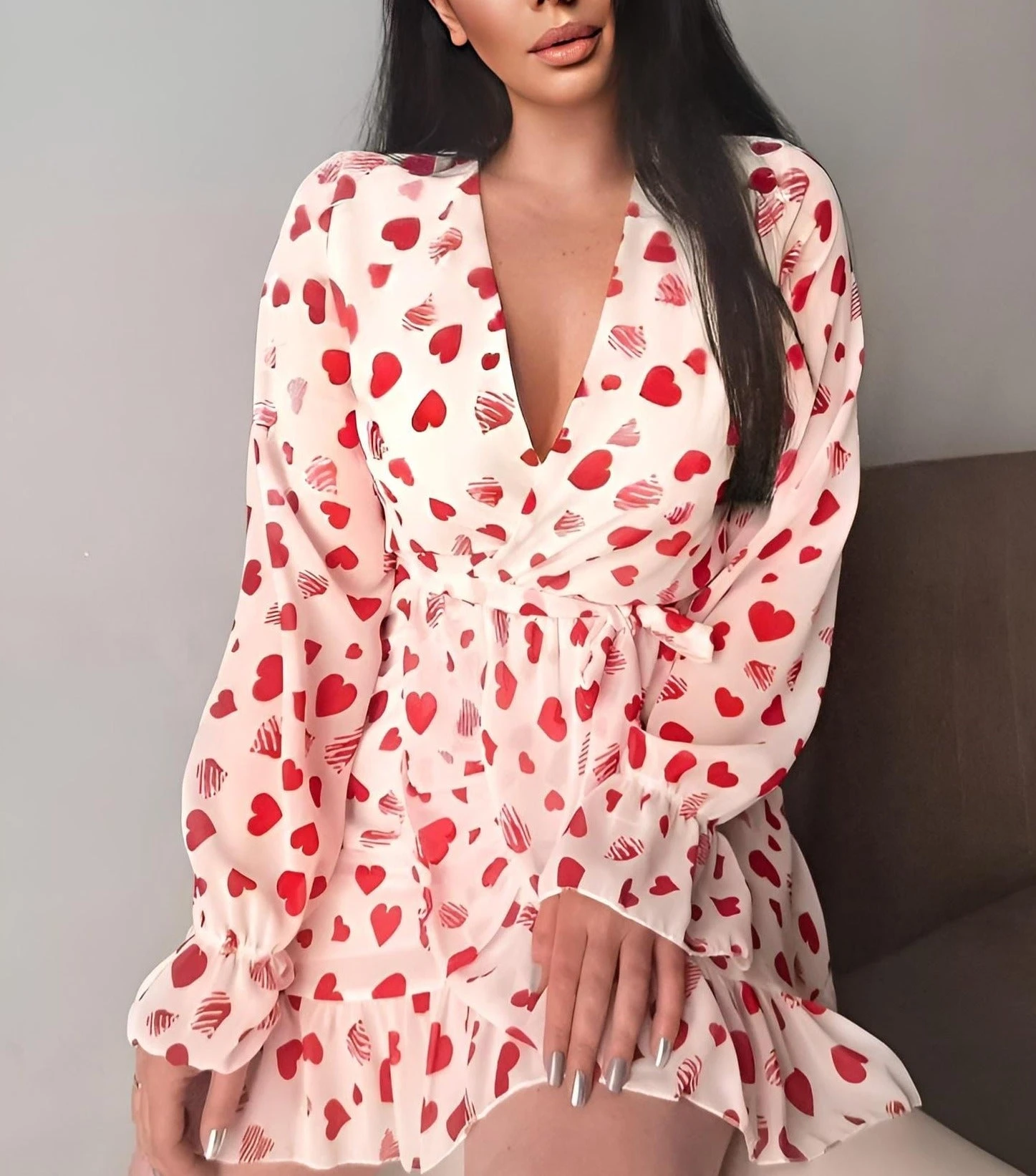 Vestito Donna Morbido Scollo V Manica Sbuffo Fantasia Cuori Volant Gonna Campana Casual Elegante