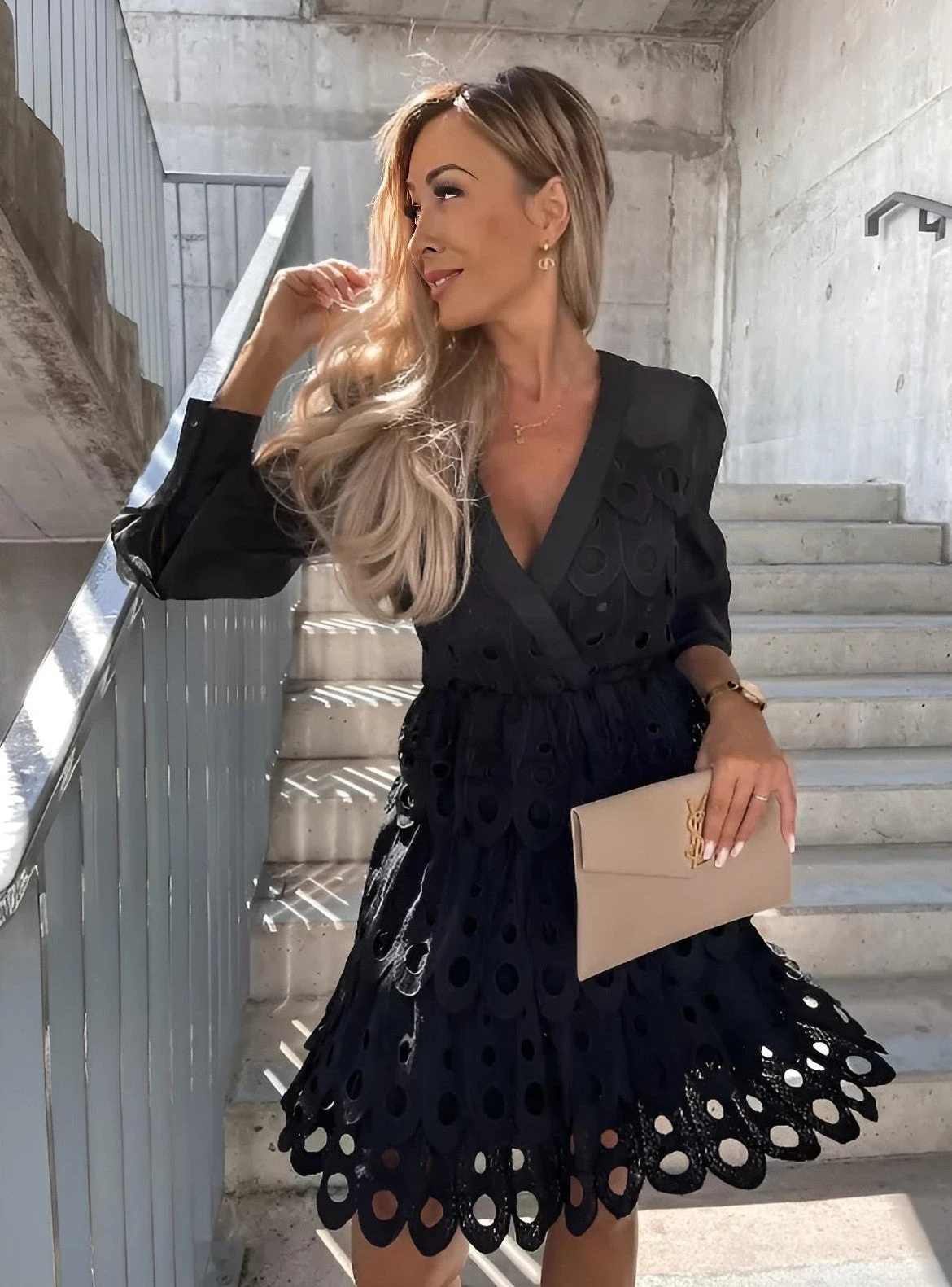 Questo abito stile casual-elegante, è un capo molto fine e all’ultima moda. Le sue caratteristiche sono: il ricamo ad occhiello, lo scollo a V, le maniche a sbuffo, la gonna a campana e la morbidezza. E’ un capo facile da abbinare con pochette, borse di varie dimensioni, decolleté e gioielli. Adatto per uscite giornaliere, pomeridiane, serali o eventi speciali. Insomma un capo così ti salverà dalle giornate indecise, rendendoti all’ultima moda e al top in ogni occasione. Il tessuto è al 95% poliestere e al 5% elastico. Si consiglia lavaggio a mano e in acqua fredda.