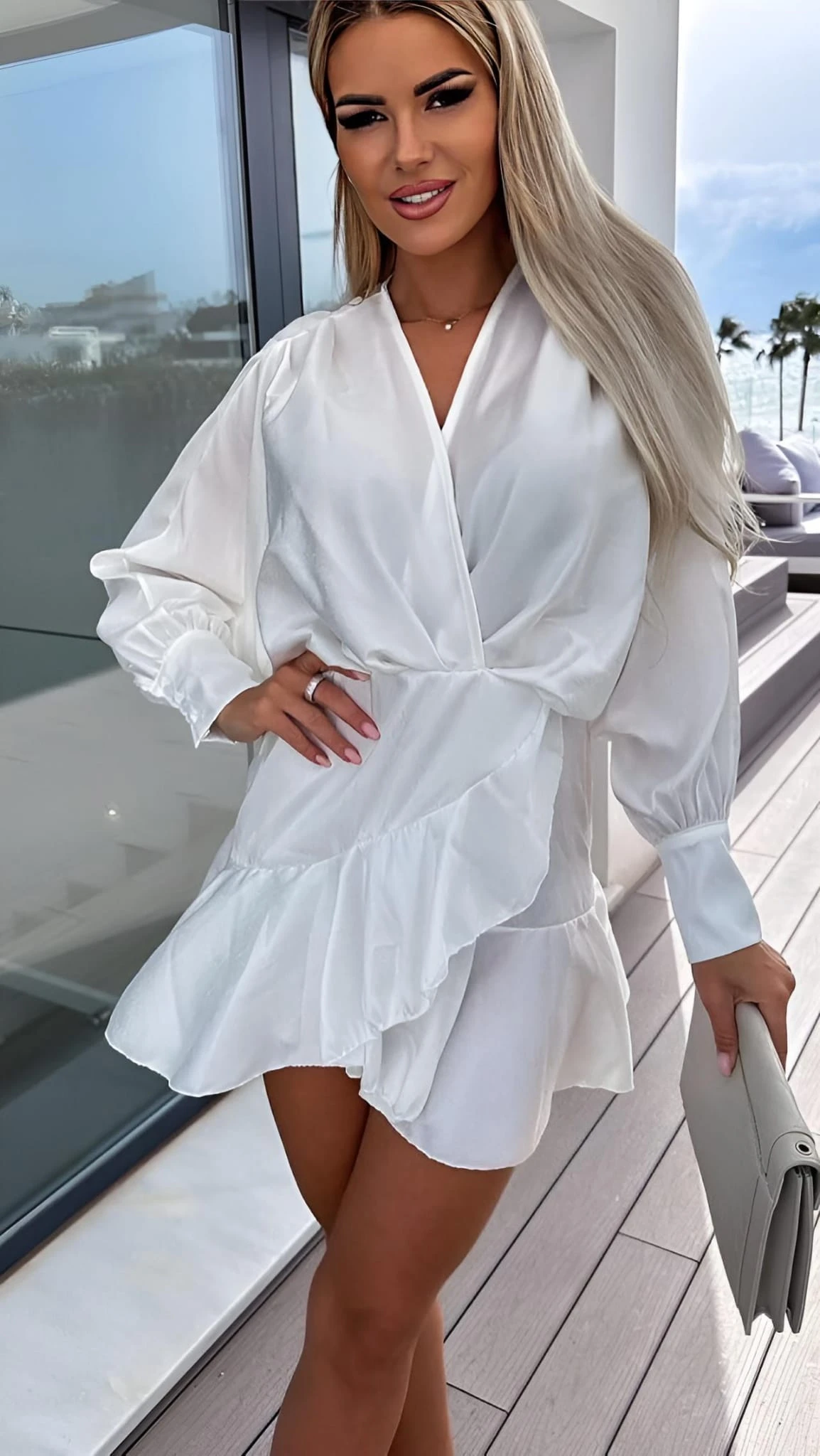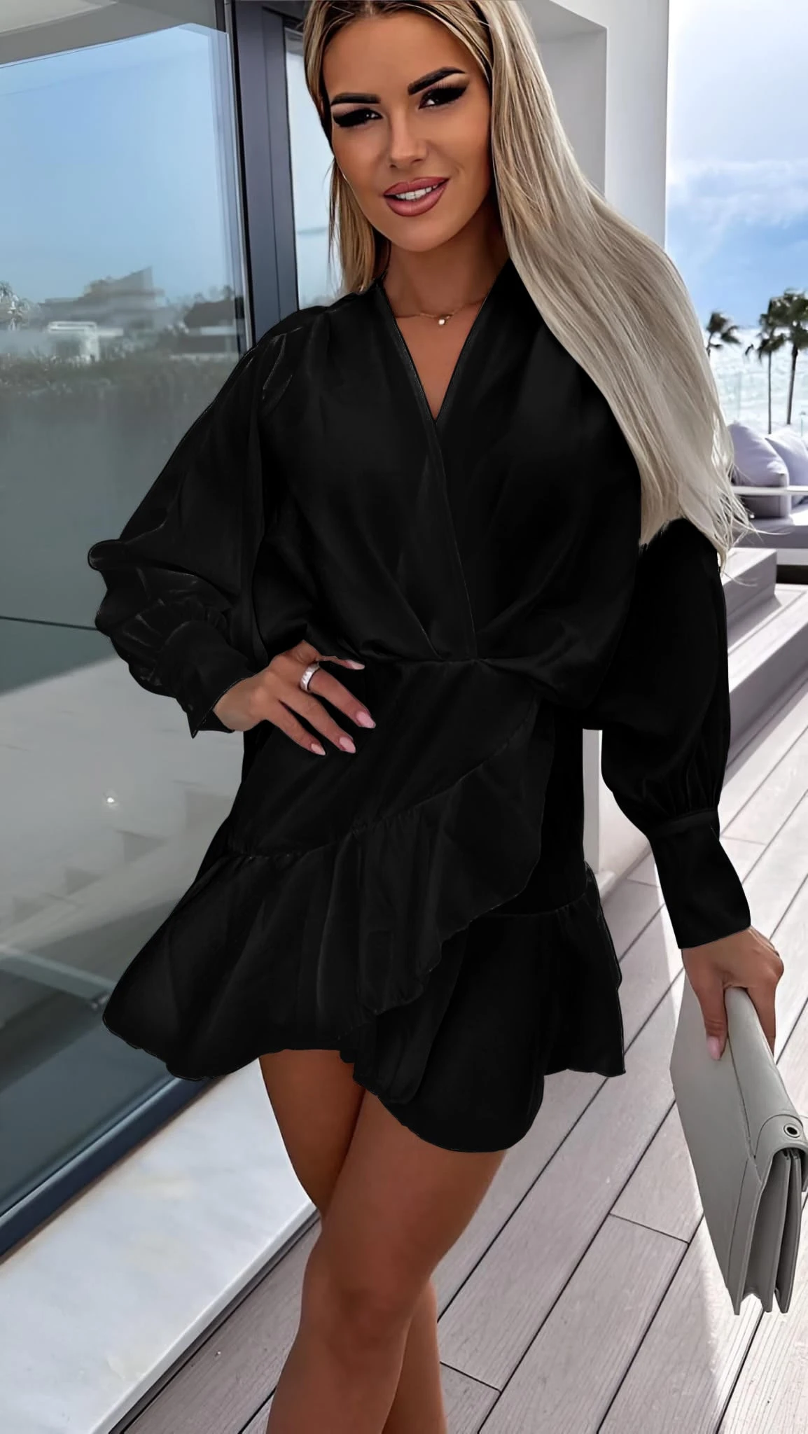 Questo vestito è un capo inimitabile nel suo genere. Indossato si posa leggermente sul corpo della donna che l’utilizza, regalandole personalità e sensualità, caratteristiche che rendono una donna sicura di sé in qualsiasi contesto essa si trovi. Le caratteristiche di questo capo sono: la morbidezza, la manica lunga a sbuffo, lo scollo a V, l’incrocio e i volant. Possono essere accostati ad esso accessori come pochette, sandali e decolleté. Può essere adatto per feste, party, cocktail party, brunch, cerimonie o giornate più easy. Il tessuto è al 95% poliestere e al 5% elastico. Si consiglia lavaggio a mano e in acqua fredda.
