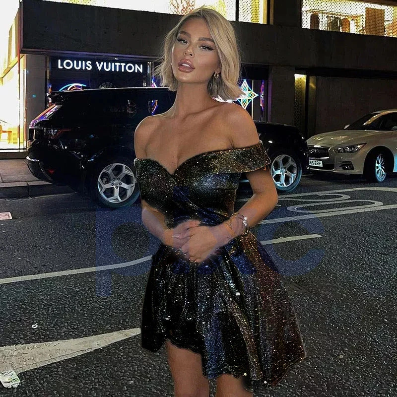 Vestito Donna Scollo Cuore Glitter Gonna Campana Sensuale Elegante