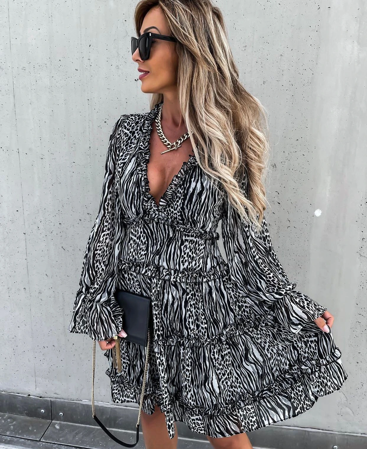 Cosa dire di questo vestito? Un capo davvero inimitabile e unico. Indossato si posa perfettamente sulle curve della donna che l’utilizza, regalandole charme ed eleganza, peculiarità che una donna ricerca per sentirsi sempre al top. I dettagli che lo caratterizzano sono: lo scollo a V, le rush, la manica a sbuffo e la fantasia animalier. Abbinato con gli accessori giusti, può essere adatto per: feste, party, cocktail party, brunch e cerimonie. Il tessuto è al 95% poliestere e al 5% elastico. Si consiglia lavaggio a mano e in acqua fredda.