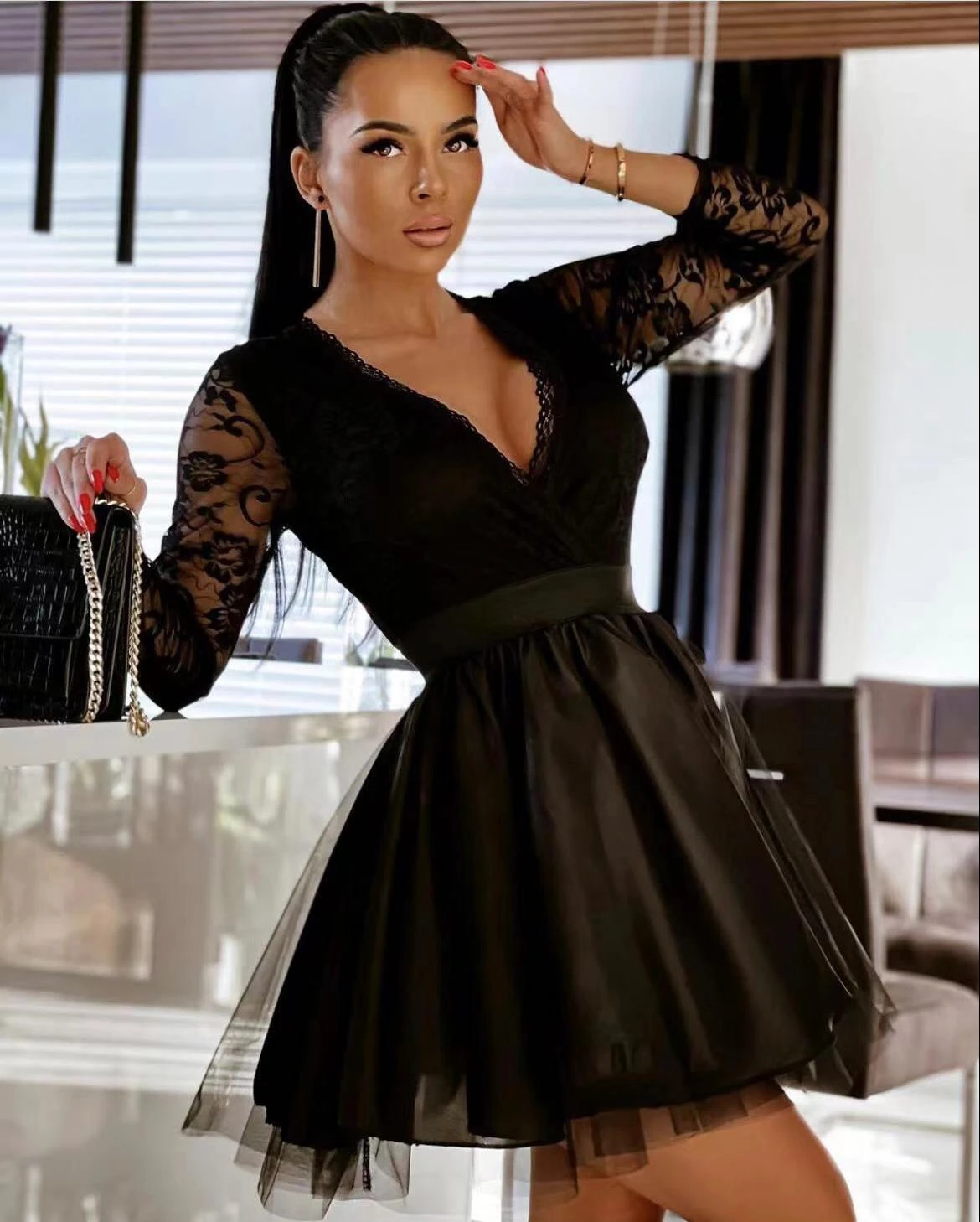 Vestito Donna Scollo V Manica Merletto Gonna Tulle Campana Elegante