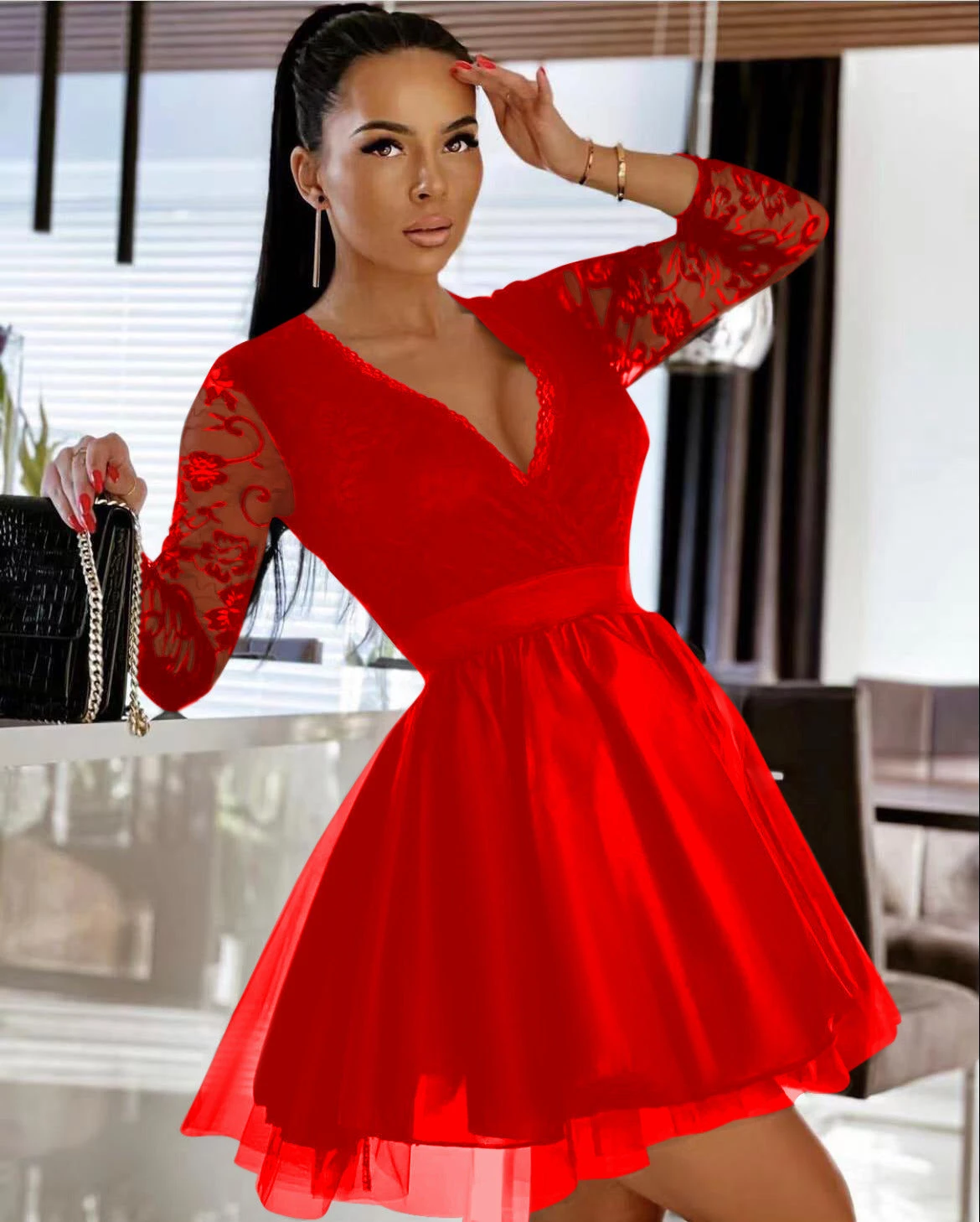 Questo vestito è un capo unico nel suo genere. Indossato si posa morbidamente sulle curve della donna che l’utilizza, regalandole sensualità ed eleganza, due caratteristiche che ogni donna ricerca in un capo. Le sue particolarità sono: la gonna a campana di tulle, la manica con merletto semitrasparente e lo scollo a v profondo. Può essere adatto per party, feste, cocktail party, branch e cerimonie. Possono essere accostati accessori come: decolté e borse di varie dimensioni. Il tessuto è al 95% poliestere e al 5% elastico. Si consiglia lavaggio a mano e in acqua fredda.