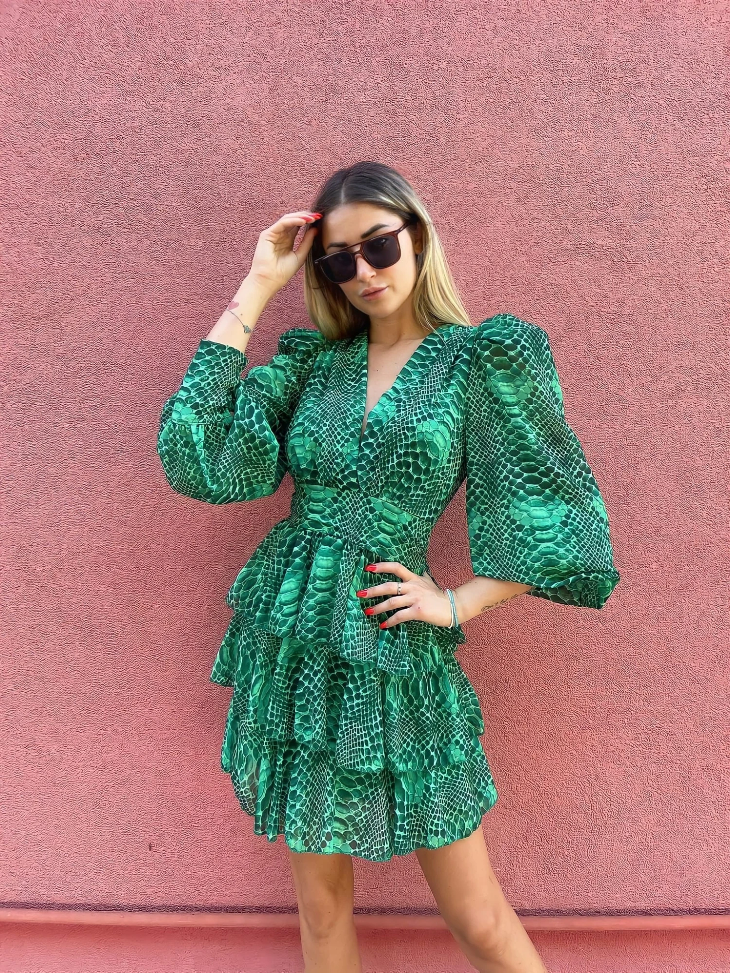 Vestito Donna Scollo V Manica Sbuffo Fantasia Pitonata Balze Casual Elegante