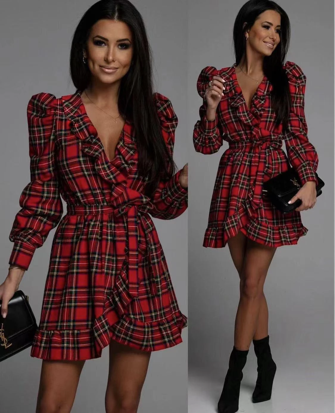 Vestito Donna Scollo V Manica Sbuffo Gonna Cintura Morbido Fantasia Scozzese