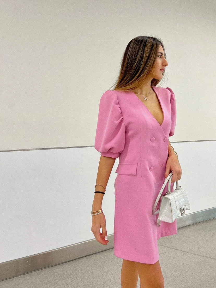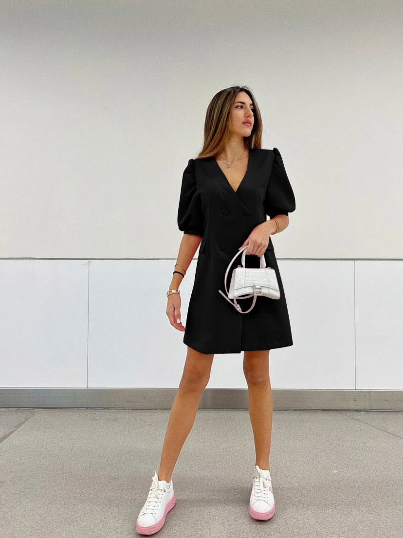 Vestito Donna Scollo V Mezzamanica Sbuffo Bottoni Blazer Casual Elegante