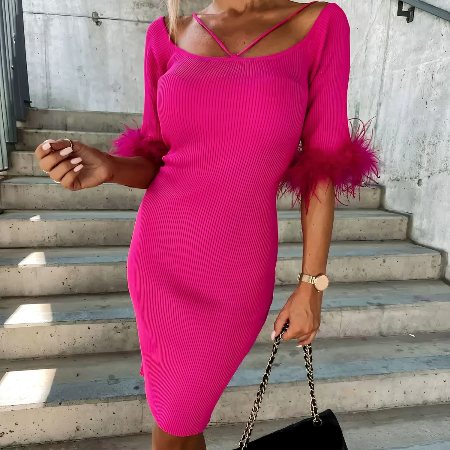 Vestito Donna Tubino Bretella Manica Corta Piume Scollo Fascia Sensuale Elegante
