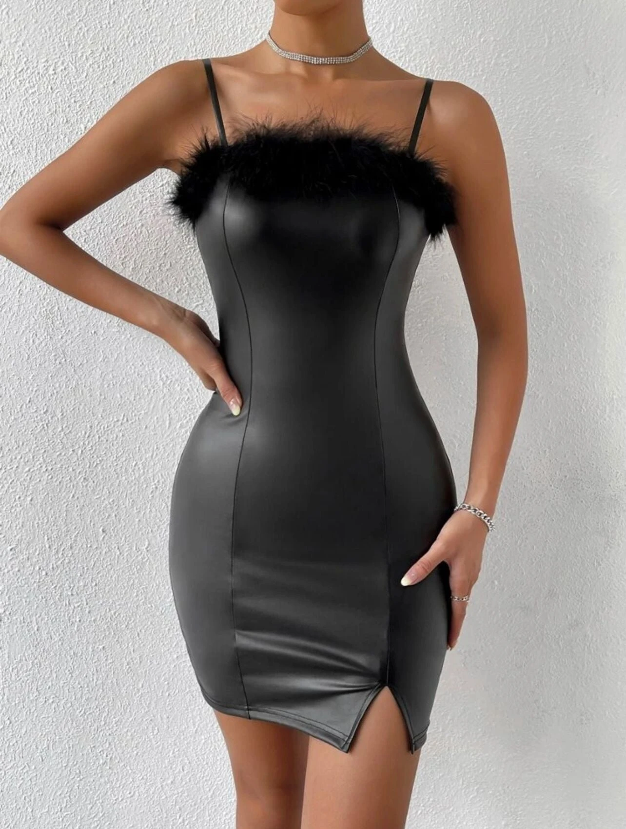 Recensisci per primo “Vestito Donna Tubino Bretelle Scollo Cuore Piume Ecopelle Aderente Spacco Casual Elegante Sensuale” Annulla risposta