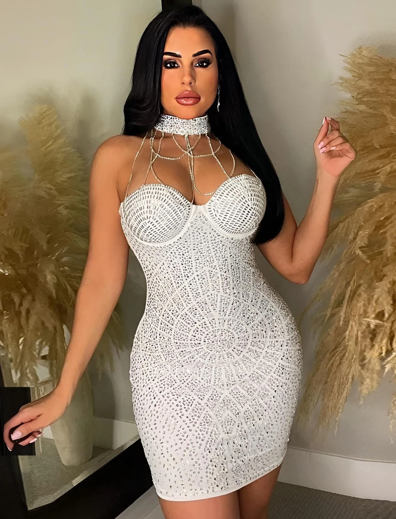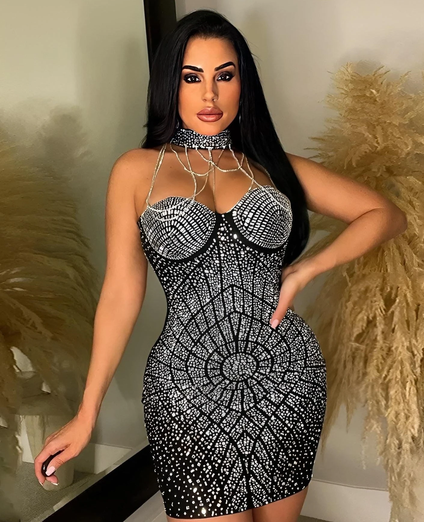 Ci sono due modi di brillare: far riflettere la luce o riprodurla, ecco la frase giusta per descrivere questo stupendo vestito a tubino. Indossato si posa delineando perfettamente le suntuosità della donna che l’utilizza, donandole personalità e sex-appeal. Le caratteristiche sono: il collarino, lo scollo a cuore, gli strass posti su tutto il capo e le catene che si posano dal seno al collarino. Può essere affiancato da accessori come: decolleté, sandali e pochette. E’ adatto per: eventi mondani, feste, cerimonie e serate all’insegna del divertimento. Il tessuto è al 95% poliestere e al 5% elastico. Si consiglia lavaggio a mano e in acqua fredda.