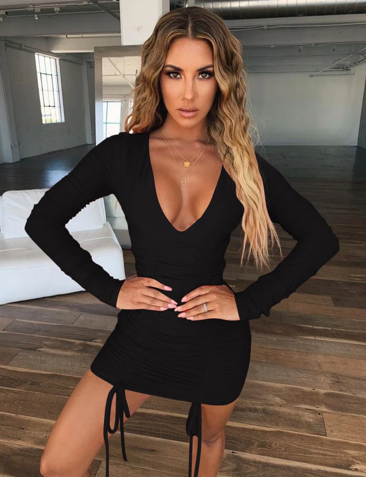 Questo abito, è un capo inimitabile nel suo genere. Indossato si posa perfettamente sulle curve della donna su cui si posa, regalandole charme e sensualità, due caratteristiche che ogni donna ricerca in un capo. Le sue caratteristiche sono: lo scollo a v profondo che rende ancor più sensuale la donna che lo indossa e la coulisse che regola la lunghezza, regalandole un effetto arricciato molto particolare. Può essere adatto per feste, party, cocktail party, branch e cerimonie. Possono essere accostati accessori come: pochette e decoltè. Il tessuto è al 95% poliestere e al 5% elastico. Si consiglia lavaggio a mano e in acqua fredda.