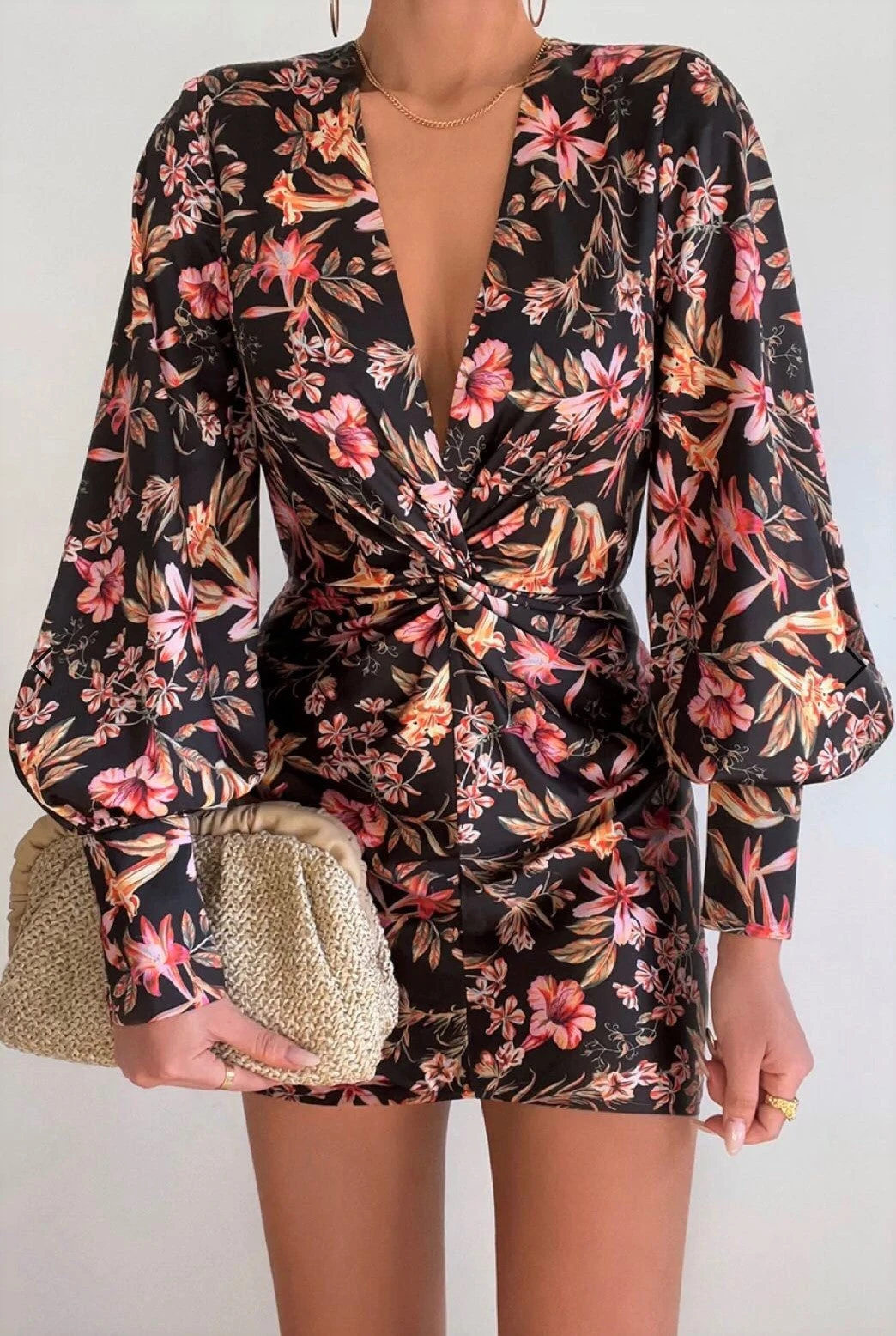 Vestito Donna Tubino Scollo V Profondo Fantasia Fiori Casual Elegante Sensuale